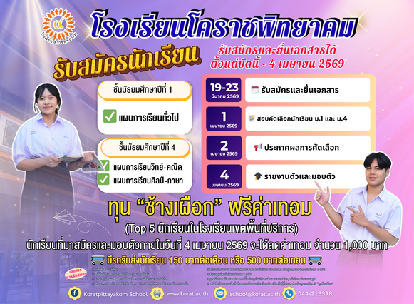 ประกาศโรงเรียนโคราชพิทยาคม เรื่อง รับสมัครคัดเลือกบุคคลเพื่อจ้างเป็นลูกจ้างชั่วคราว ตำแหน่ง ครูผู้สอนวิชาภาษาไทย